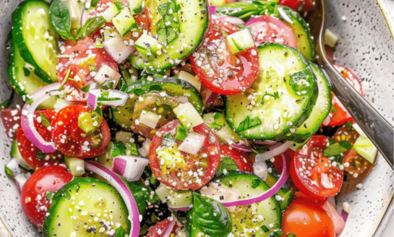 - Your Vegan Cucumber Tomato Salad is ready to serve!