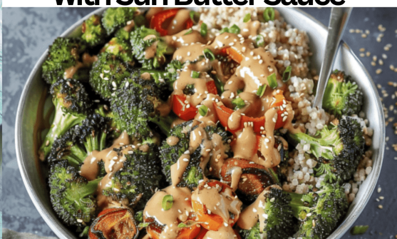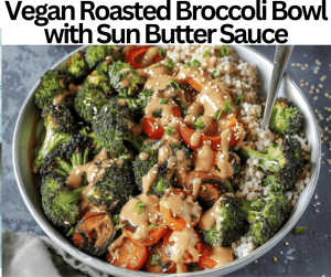 This vegan roasted Broccoli Bowl with Sun Butter Sauce is a healthy, straightforward dish that is full of taste & texture. Roast the broccoli, red peppers, carrots, & onions till the edges are crisp & caramelized. The creamy sun butter sauce, which we make with rice vinegar, soy sauce, low-carb maple syrup, sunflower seed butter, & a little ginger & garlic, is the standout feature. This vegan roasted Broccoli Bowl with Sun Butter Sauce provides warmth and nutrients in one vibrant bowl, regardless of your dietary restrictions or preference for a hearty, vegetable-forward meal.