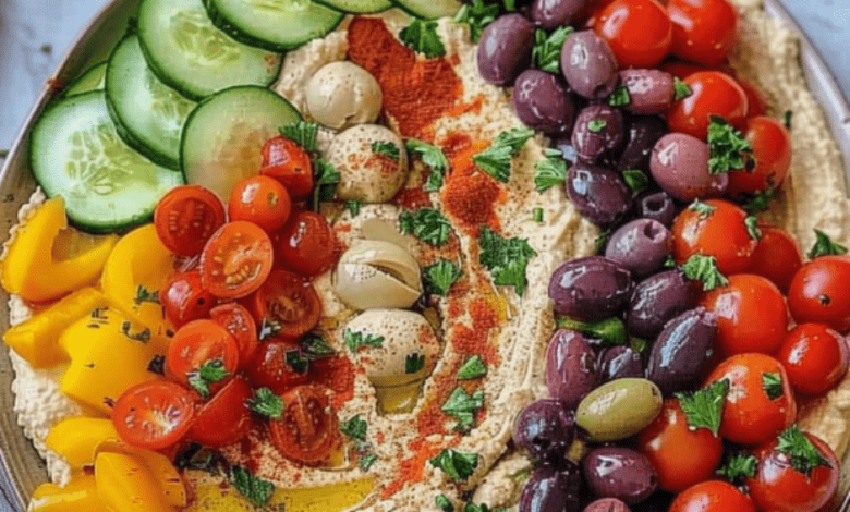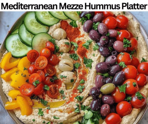 An all-vegetarian Mediterranean meal. The Vegan Mediterranean Mezze Hummus Platter is an ideal sharing dish, featuring vibrant textures, robust flavors, and fresh ingredients. This colorful dish combines marinated olives, warm pita, crisp vegetables, creamy hummus, and a flavorful dip that evokes the Mediterranean. This Vegan Mediterranean Mezze Hummus Platter is healthy, filling, and completely plant-based, with a perfect balance of fiber, protein, and healthy fats to keep you full and energized.