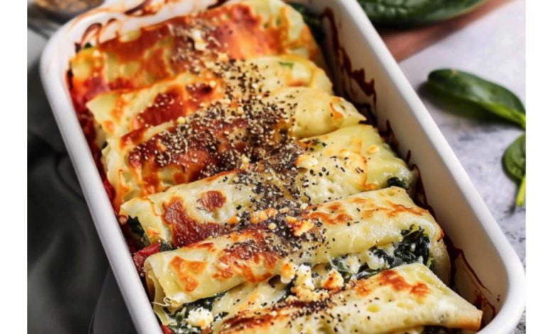 If you want something decadent, savory, and cozy, try these oven-baked vegan Spinach and Feta-Filled Crepes. Delicate golden crepes are served with a rich, revitalizing feta and spinach filling. Every bite of this vegan Spinach and Feta-Filled Crepes combines the texture of the soft crepes, tangy cheese, and earthy greens that have been perfectly baked. This dish is ideal for a light dinner that feels gourmet but is easy to prepare, as well as a lovely brunch centerpiece. This recipe is adaptable enough to fit a vegan or vegetarian diet.