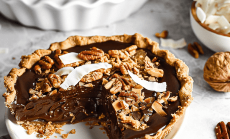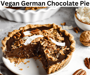 This Vegan German Chocolate Pie is a decadently chocolate and luscious layer cake of coconut and pecan yumminess. It does not require an oven. This vegan alternative retains the traditional taste of the German chocolate cake. It transforms it into a refreshing, creamy, and filling pie. It is prepared using healthy dairy-free ingredients & does not contain any refined sugars, so it is a guilt-free treat. pie makes it easy to indulge. The rich chocolate filling with a crunchy, nut-coconut topping makes Vegan German Chocolate Pie a delicious holiday pie. It’s also a potluck favorite, or for any day when you want something special and satisfying.