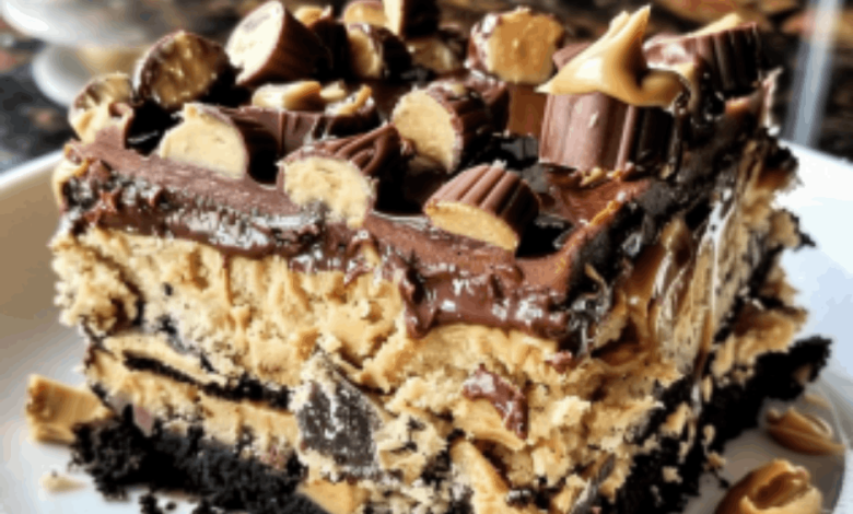 - Over the batter, spread vegan chocolate chips and chopped peanut butter cups.
