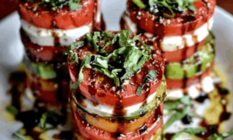 - Then you will drizzle olive oil and balsamic glaze on the top of the tower.