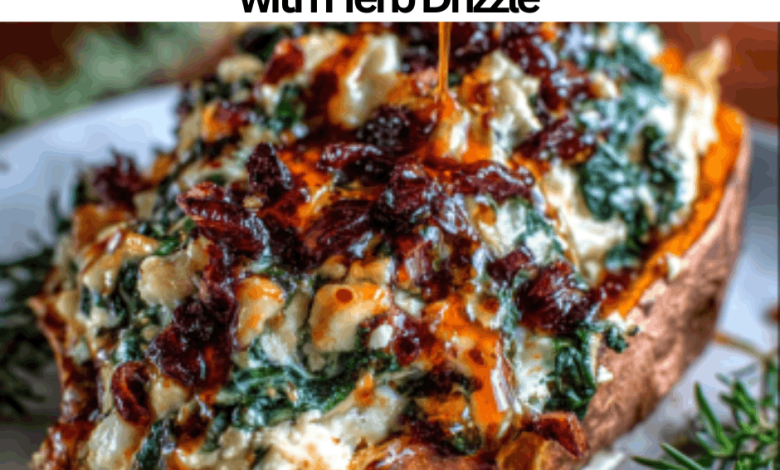 - Lastly, you will whisk all herb drizzle ingredients in a small bowl and spread them onto the stuffed sweet potatoes.