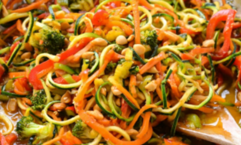 Make Vegan Zucchini Noodle Stir-Fry in twenty-five minutes. It is a light dish, and it will not let us feel hungry till the next meal. One serving of this has 180 calories. It is the base of your recipe, and it is full of fiber. You will only require a few basic things to make this recipe. We can make this dish with zucchini, garlic cloves, ginger paste, sesame oil, sliced bell peppers, broccoli florets, carrots, cornstarch, green onions, maple syrup, and some sauces. Store this dish for two days. Enjoy the Vegan Zucchini Noodle at parties, family gatherings, and occasions.